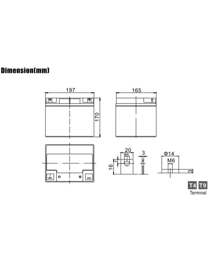 12 V 45 Ah applicazioni scarica rapida (UPS, jump starter) vita attesa 10 anni dim.: 197 x 165 x 170 x 170 (incl. terminale) 14,5 kg terminale T9