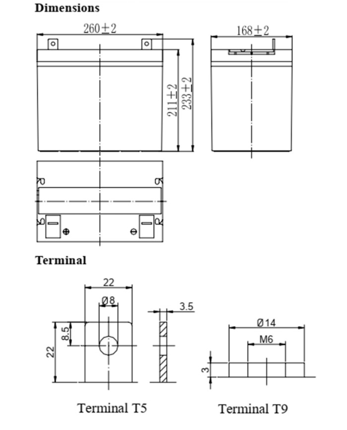 12 V 80 Ah applicazioni scarica rapida (UPS, jump starter) vita attesa 10 anni dim.: 260 x 168 x 211 x 233 (incl. terminale) 25,5 kg terminale T9