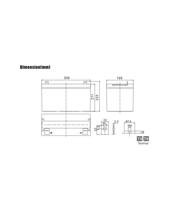 12 V 90 Ah applicazioni scarica rapida (UPS, jump starter) vita attesa 10 anni dim.: 306 x 169 x 211 x 233 (incl. terminale) 30,5 kg terminale T9