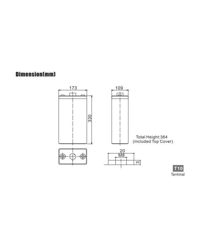 2 V 200 Ah applicazioni stand-by alta capacità vita attesa 18 anni dim.: 173 x 109 x 330 x 364 (incl. terminale) 14 kg terminale T10