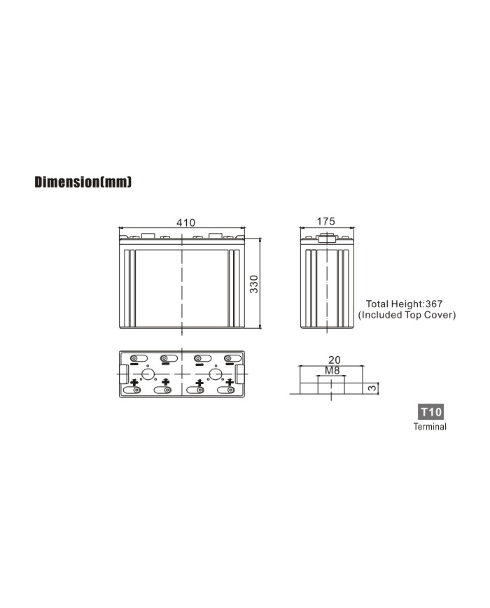 2 V 800 Ah applicazioni stand-by alta capacità vita attesa 18 anni dim.: 410 x 175 x 330 x 367 (incl. terminale) 54 kg terminale T10