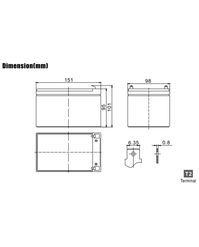 12 V 10 Ah applicazioni stand-by vita attesa 10 anni dim.: 151 x 98 x 95 x 101 (incl. terminale) 3,5 kg terminale T2