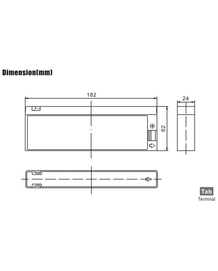 12 V 2,3 Ah applicazioni stand-by vita attesa 5 anni dim.: 182 x 24 x 62 x 62 (incl. terminale) 0,71 kg terminale TAB