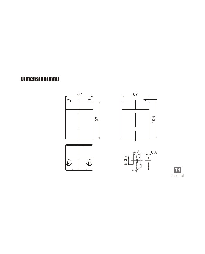 12 V 2,8 Ah applicazioni stand-by vita attesa 5 anni dim.: 67 x 67 x 97 x 103 (incl. terminale) 1 kg terminale T1 5