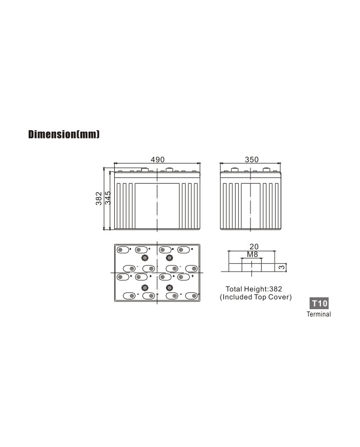 2 V 2400 Ah applicazioni stand-by alta capacità vita attesa 18 anni dim.: 490 x 350 x 345 x 382 (incl. terminale) 138 kg terminale T10