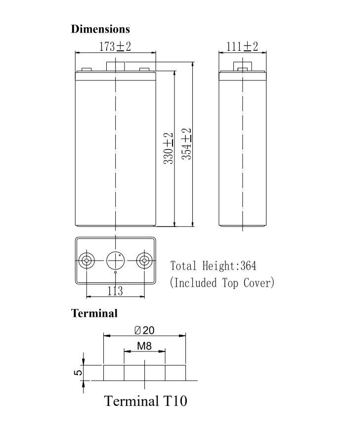 2 V 250 Ah applicazioni stand-by alta capacità vita attesa 18 anni dim.: 173 x 109 x 330 x 364 (incl. terminale) 15 kg terminale T10