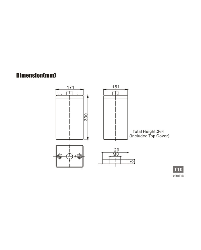 2 V 350 Ah applicazioni stand-by alta capacità vita attesa 18 anni dim.: 171 x 151 x 330 x 364 (incl. terminale) 20,5 kg terminale T10