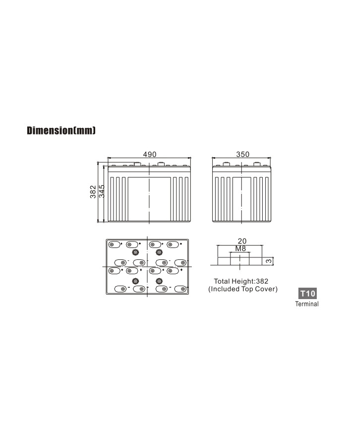 2 V 2000 Ah applicazioni scarica rapida (UPS) alta capacità vita attesa 20 anni dim.: 490 x 350 x 345 x 382 (incl. terminale) 130 kg terminale T10