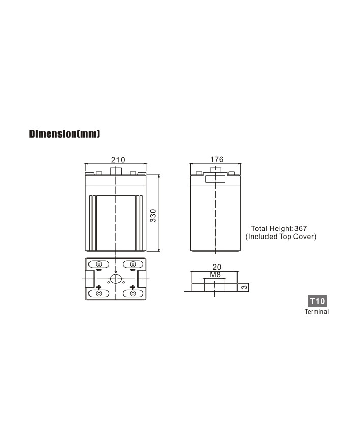 2 V 400 Ah applicazioni scarica rapida (UPS) alta capacità vita attesa 20 anni dim.: 210 x 176 x 330 x 367 (incl. terminale) 27 kg terminale T10