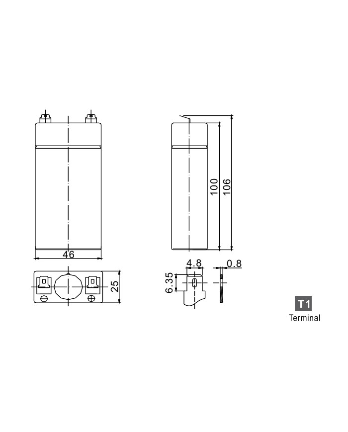 2 V 5 Ah applicazioni stand-by vita attesa 5 anni dim.: 46 x 25 x 100 x 106 (incl. terminale) 0,3 kg terminale T1 0