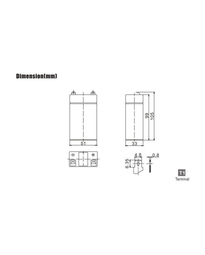 2 V 6 Ah applicazioni stand-by vita attesa 5 anni dim.: 51 x 33 x 99 x 105 (incl. terminale) 0,36 kg terminale T1