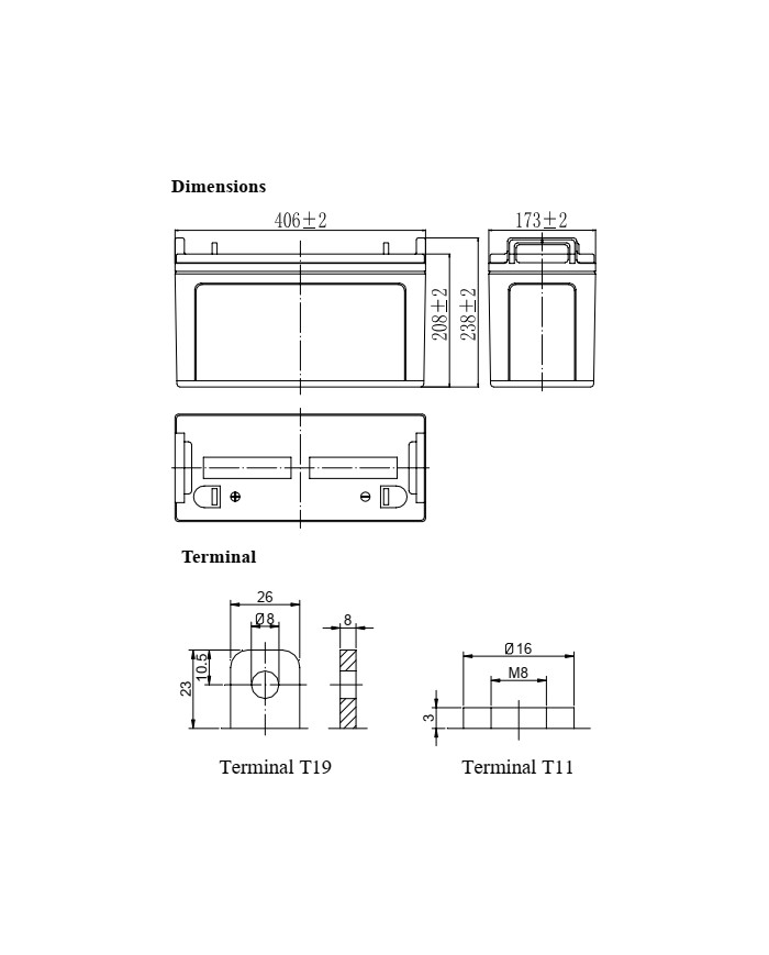 12 V 100 Ah applicazioni stand-by vita attesa 10 anni dim.: 406 x 173 x 208 x 238 (incl. terminale) 31,5 kg