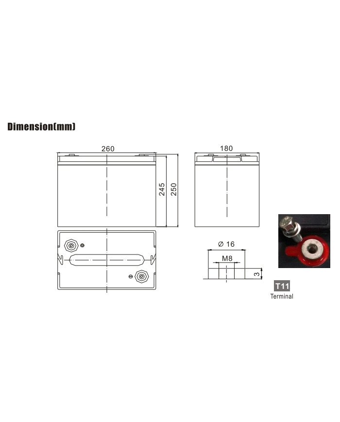 6 V 150 Ah applicazioni stand-by vita attesa 10 anni dim.: 260 x 180 x 245 x 250 (incl. terminale) 23,5 kg terminale T11