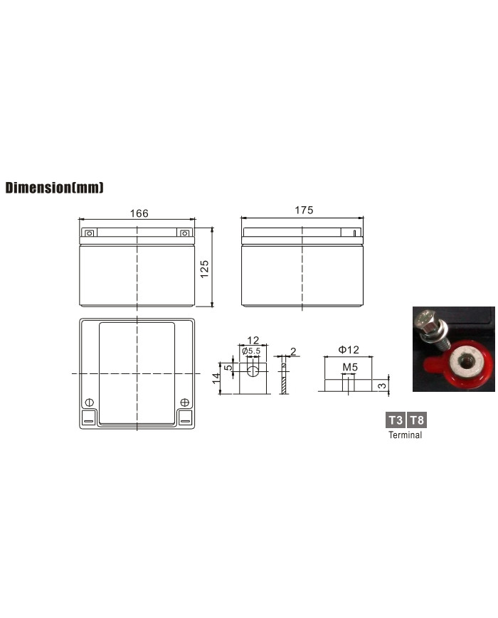 12 V 24 Ah applicazioni cicliche (auto e bici elettriche, sedie a rotelle) vita attesa 5 anni dim.: 166 x 175 x 125 x 125 (incl. terminale) 8,2 kg terminale T8