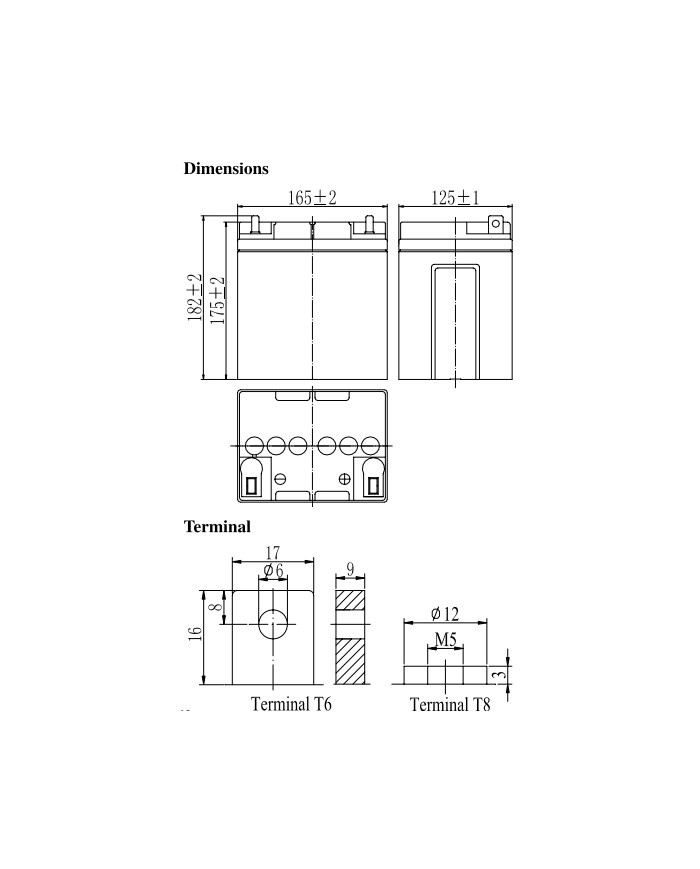 12 V 28 Ah applicazioni cicliche (auto e bici elettriche, sedie a rotelle) vita attesa 5 anni dim.: 165 x 125 x 175 x 182 (incl. terminale) 9,5 kg terminale T8