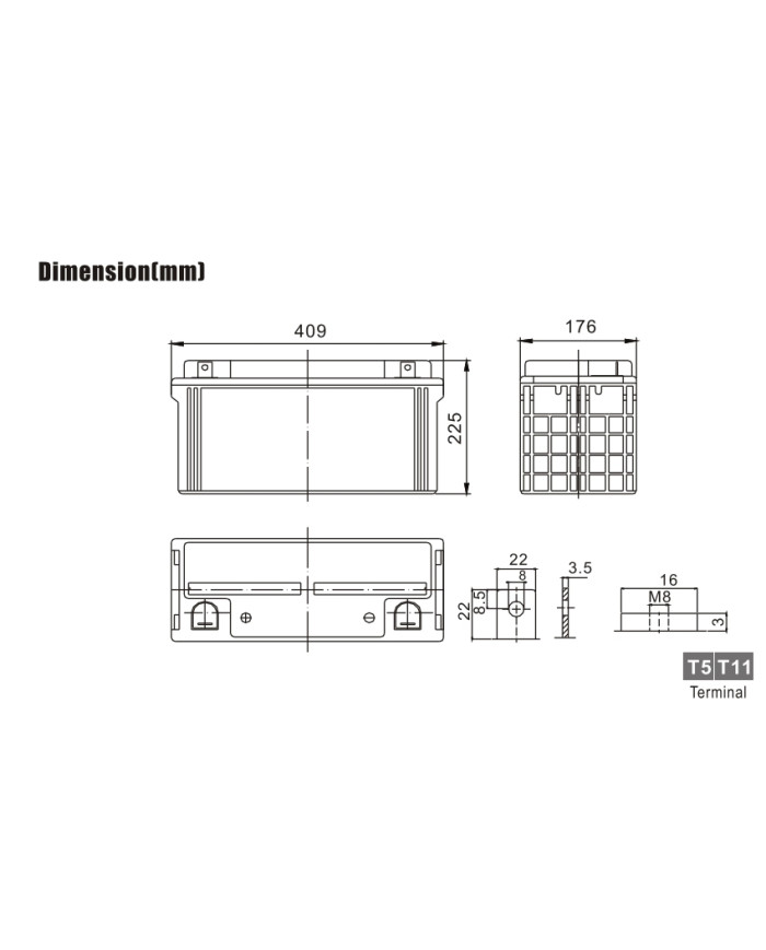 12 V 120 Ah applicazioni cicliche (auto e bici elettriche, sedie a rotelle) vita attesa 10 anni dim.: 409 x 176 x 225 x 225 (incl. terminale) 35,5 kg terminale T11