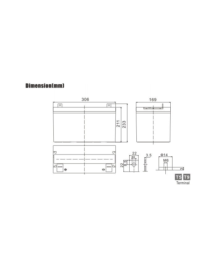 12 V 90 Ah applicazioni cicliche (auto e bici elettriche, sedie a rotelle) vita attesa 10 anni dim.: 306 x 169 x 211 x 233 (incl. terminale) 27 kg terminale T9