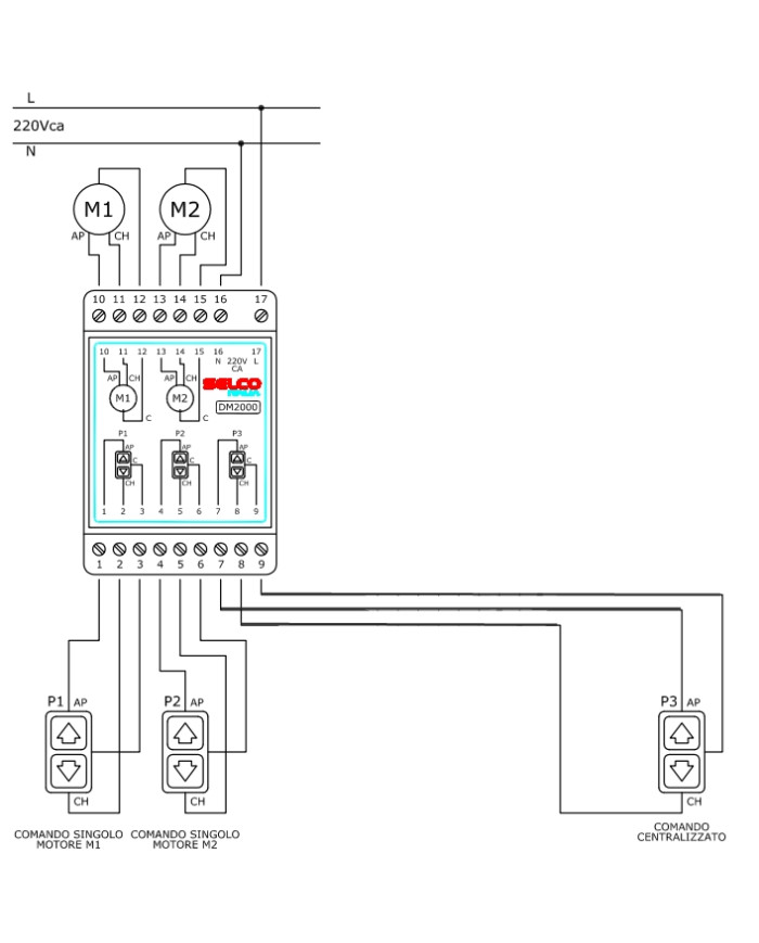 La centralina relè DM2000 permette sia di comandare singolarmente due tapparelle attraverso il doppio pulsante posto in prossimita' delle stesse che di centralizzarne l'apertura e la chiusura attraverso uno o più doppi pulsanti posti in punti appropriati.