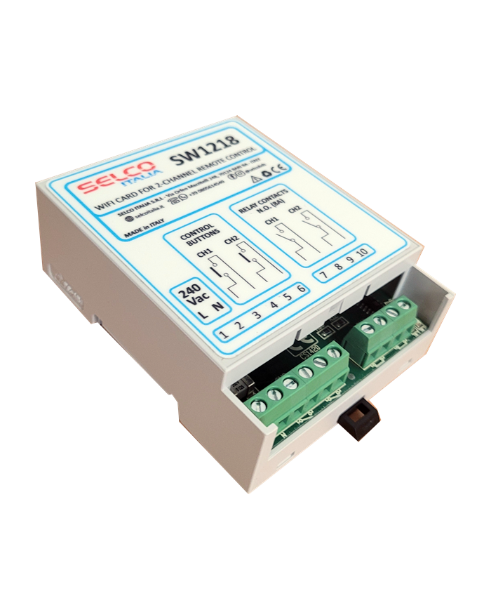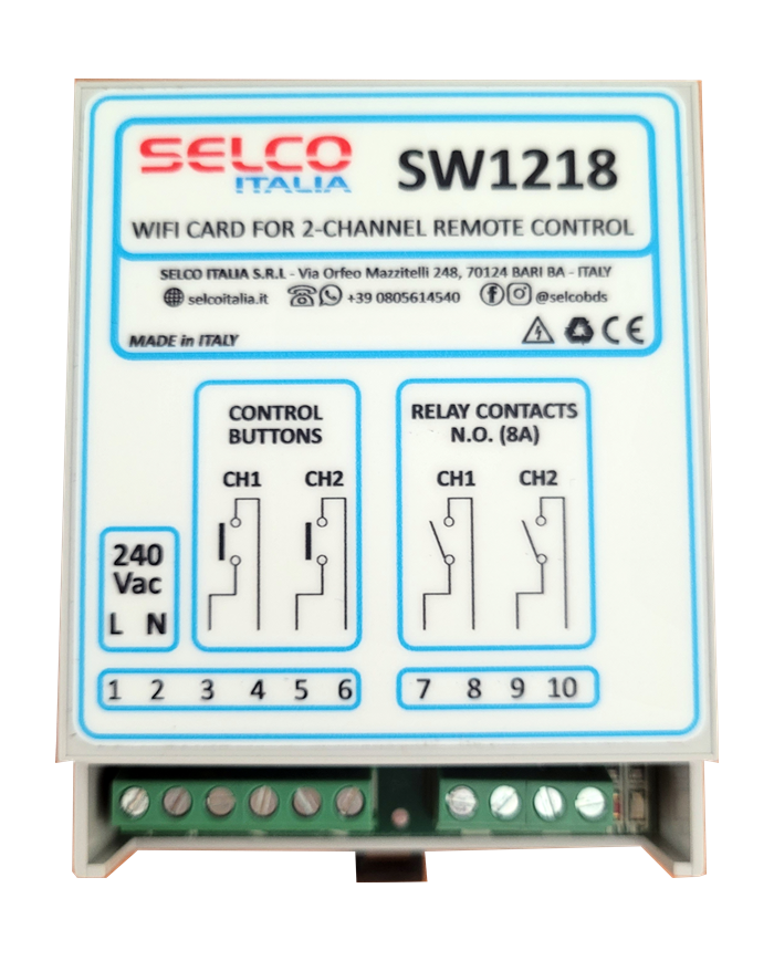 Il modulo consente il comando a distanza tramite APP (Android o IOS) DUE utenze quali lampadine, serrature elettriche e piccole utenze elettriche.Con l'interposizione di appositi relè o teleruttori può gestire carichi più potenti.Predisposta per montaggio su guida DIN.